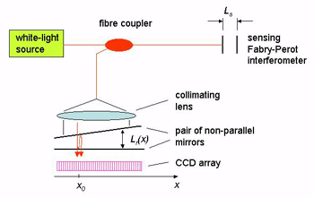 例如,干涉儀由兩個非平行的鏡子組成,以透射方式工作??梢钥闯觯瑲庀禠r(x)取決于沿鏡子的位置x,并且在位置x0處產(chǎn)生最大干涉信號,其中Lr(x0)與傳感干涉儀的間隙Ls精確匹配。該位置x0很容易由安裝在鏡子后面的CCD陣列確定。