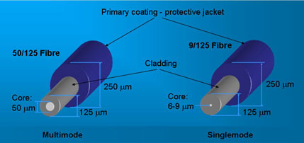 這些不同的路徑被稱(chēng)為空間模式,因此描述為多模光纖。單模光纖電纜具有小芯,其僅允許光線(xiàn)的一條路徑穿過(guò)光纖,因此描述為單模光纖。多模光纖通常具有兩種不同的芯尺寸:50微米或62.5微米。單模電纜采用9微米玻璃芯。